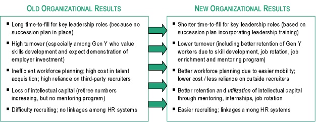 Revisiting the "Organizational Results" part of the larger OPM quad, what improved results can we expect with the implementation of a well-supported career development program? (By "well-supported" we mean it is based on a needs assessment, sufficient resources, top leaders' support, continuous evaluation, and it is integrated into HR structures.) The graphic below shows the transformation possible: